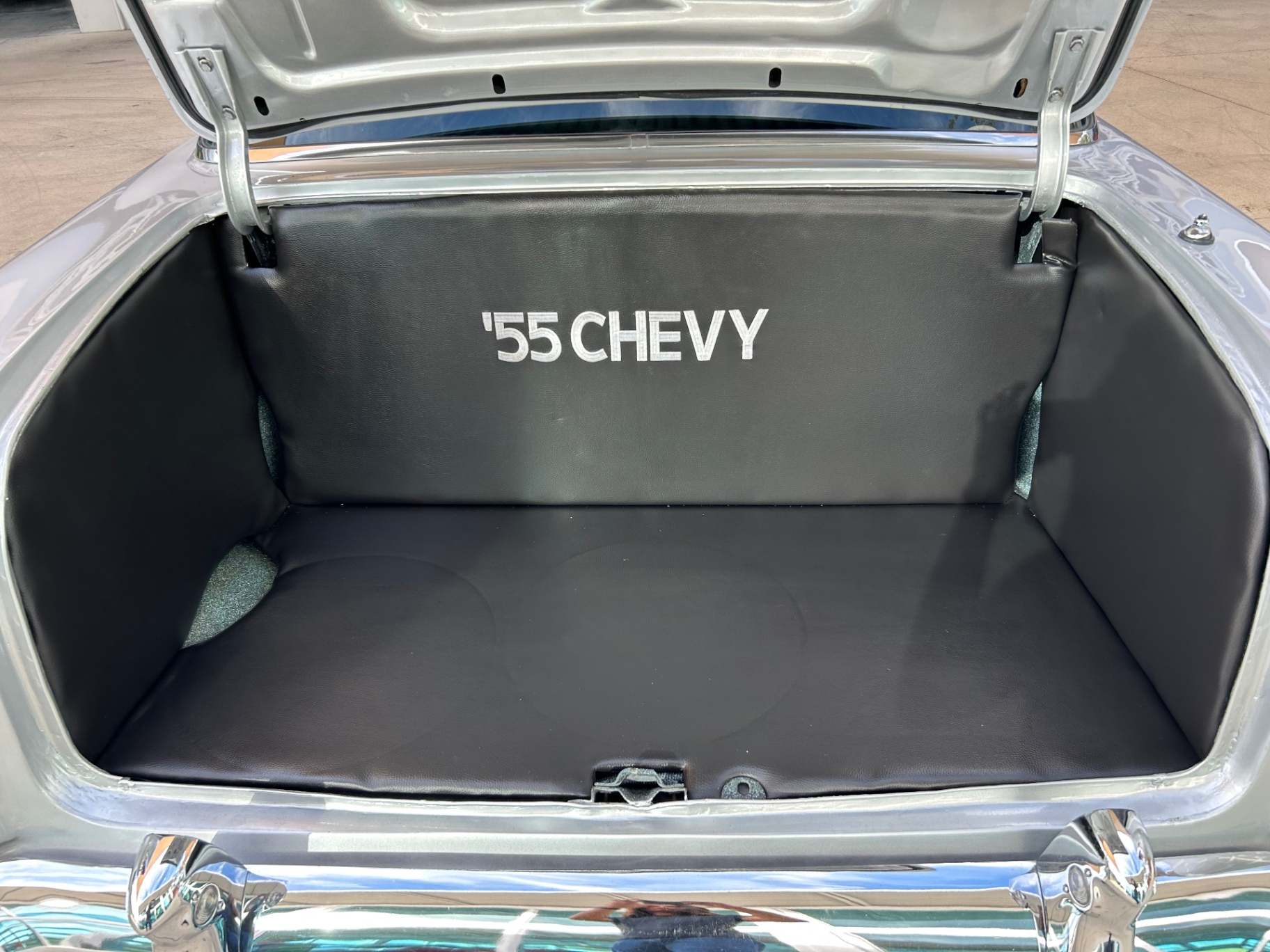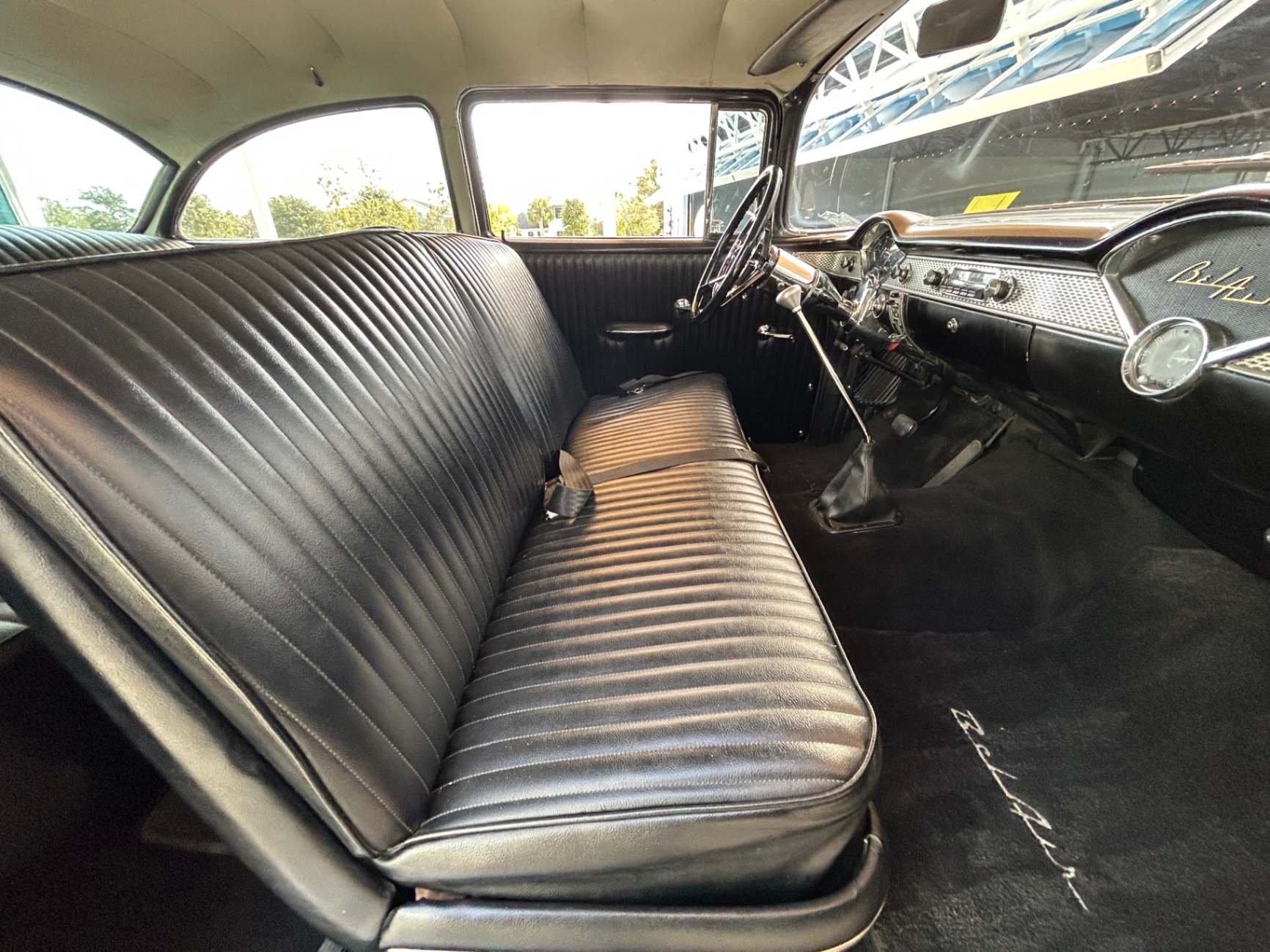 The exterior of the 1955 Chevrolet Black Bel Air showcases the classic lines and chrome accents that define this era of automotive design. Its black paint is glossy and lustrous, adding a touch of timeless elegance to its overall appearance. The iconic Bel Air badge proudly adorns the front grille, further accentuating its status as a true classic.